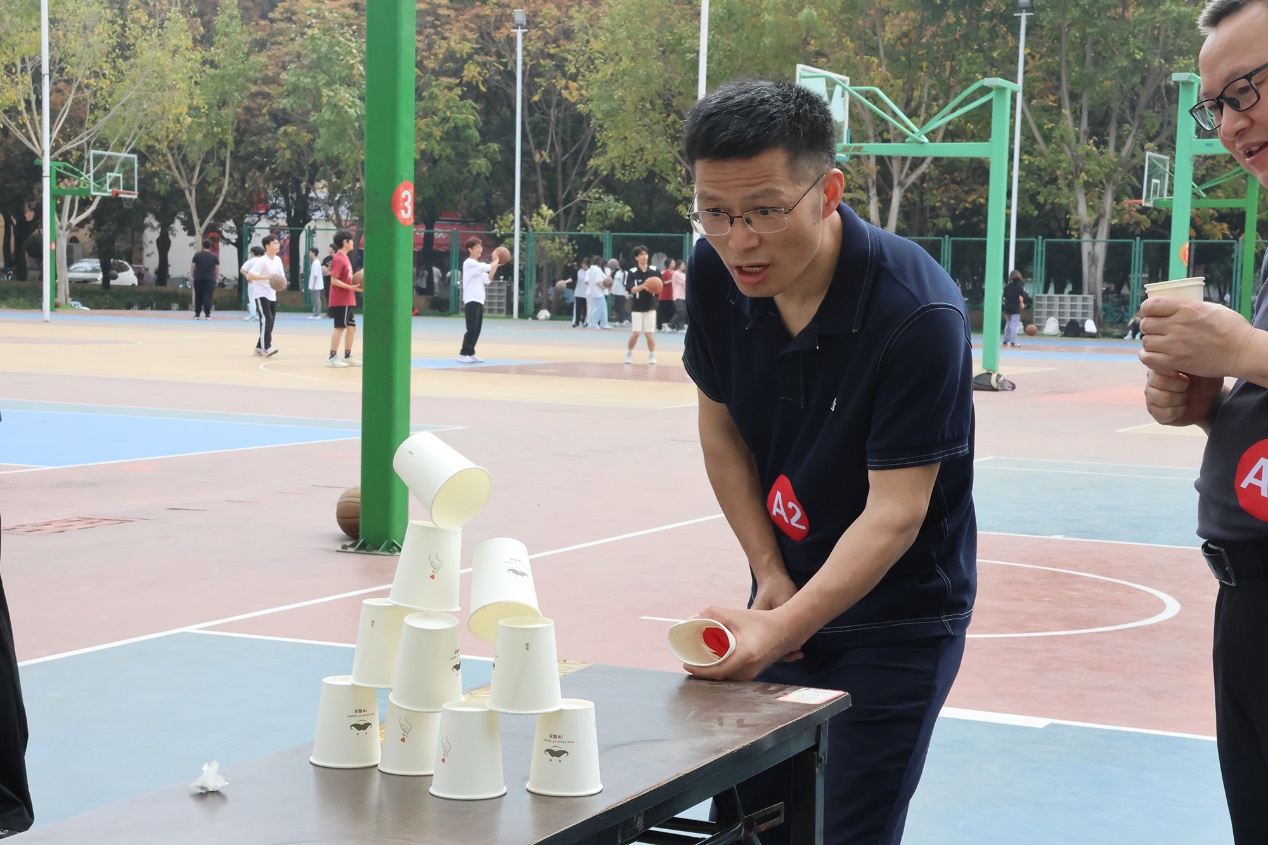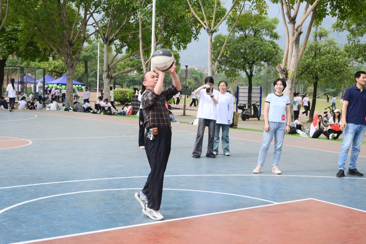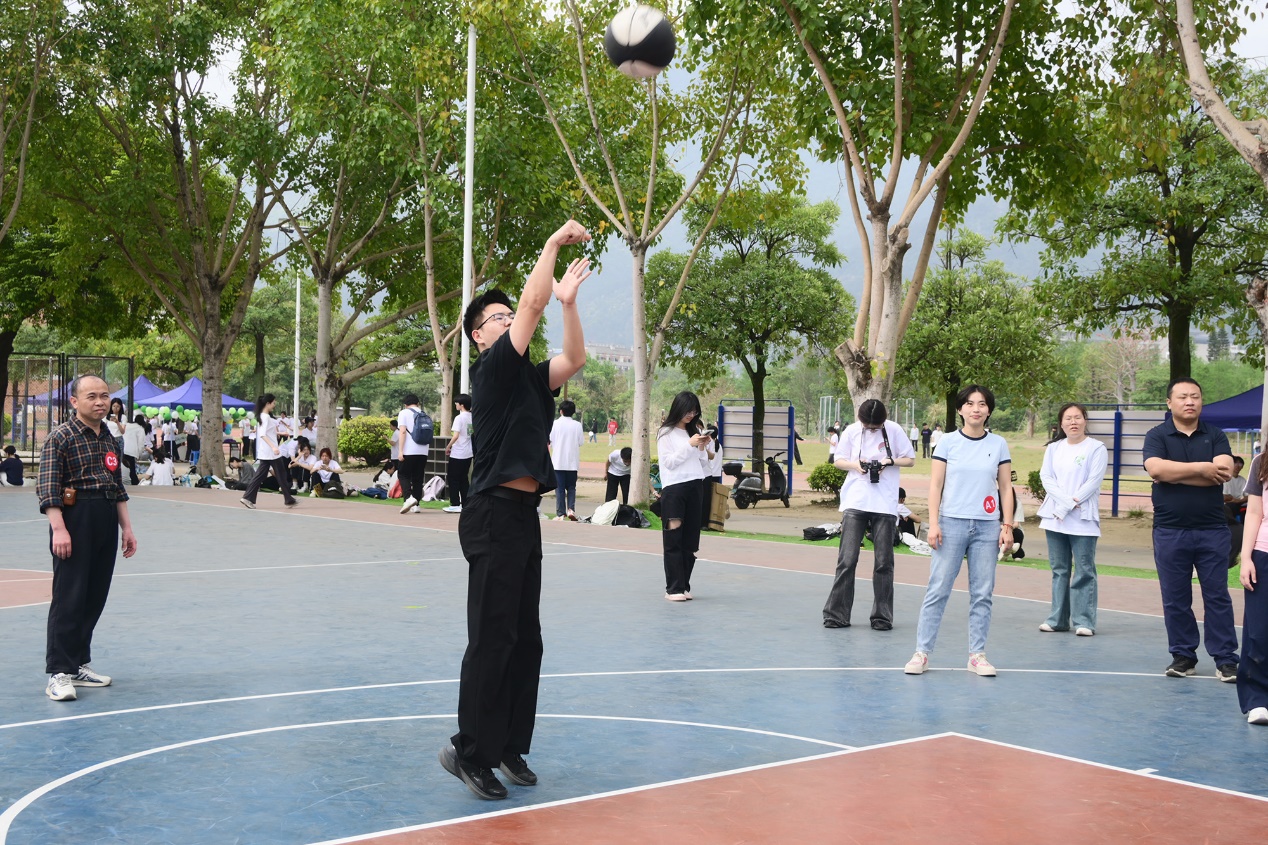 平日执笔握管的双手,在“定点投篮”项目中化身投篮“利器”。教职工们站在罚球线前,屈膝、托球、抖腕一气呵成,篮球在空中划出优美抛物线。清脆的“唰”声与篮筐的“铛铛”回响此起彼伏,无论命中与否,场边喝彩声始终不断,严谨的学者风范与运动的活力在此刻完美交融。